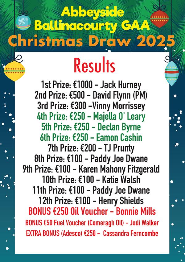 Abbeyside/Ballinacourty GAA Club would like to congratulate each winner in our Christmas Draw.